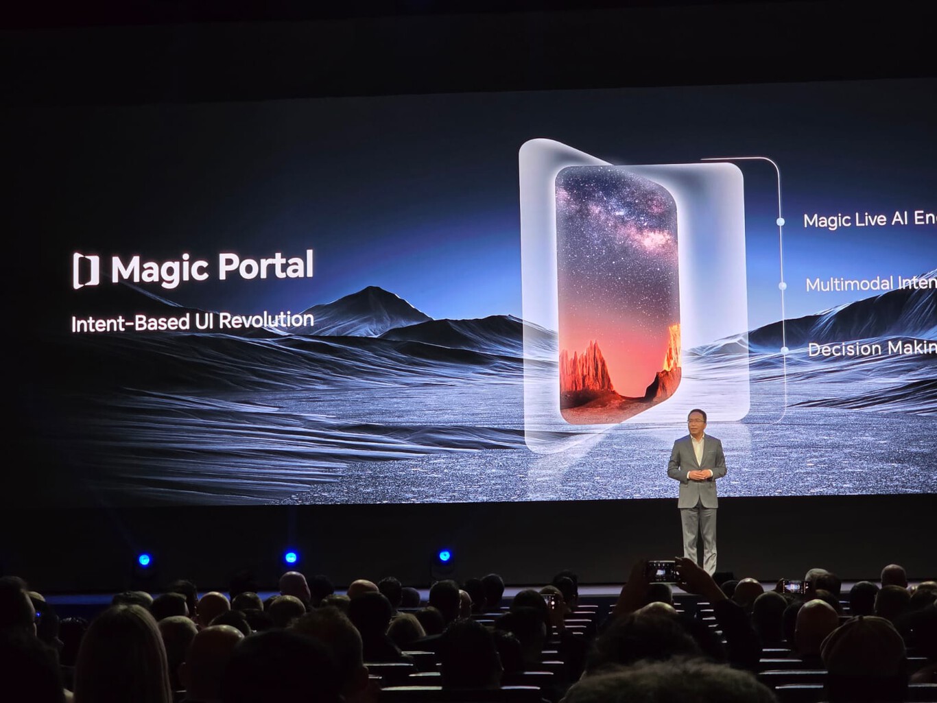 Durante su discurso principal, el CEO de la compañía, George Zhao, mostró avances en IA que, afirmó, entienden lo que desea el usuario y pueden, por tanto, adelantarse para hacer más sencillo el proceso. Zhao dio ejemplos de acciones que pueden tomar siete u ocho pasos en plataformas de dispositivos rivales y que en el nuevo Honor se ven reducidas, dijo, a apenas un paso.